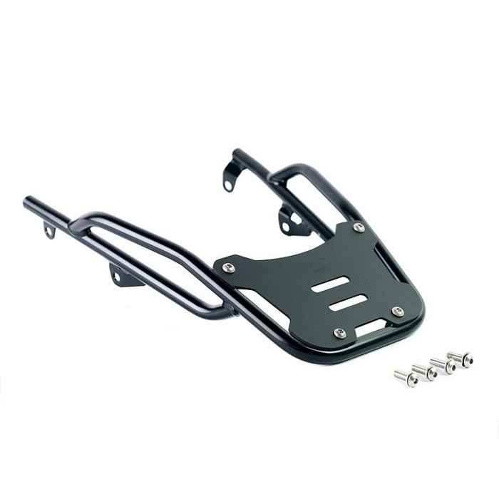 Σχάρα αποσκευών από ατσάλινο σωλήνα με ματ μαύρο φινίρισμα εποξειδικής πούδρας. Ολοκληρώνει το πίσω μέρος και είναι εξοπλισμένο με χειρολαβές για τον συνεπιβάτη. Στερεώνεται πολύ απλά στο πλαίσιο της μοτοσικλέτας στα 4 σημεία στερέωσης. Στιβαρό και πρακτικό, ολοκληρώνει την αισθητική της μοτοσυκλέτας.
