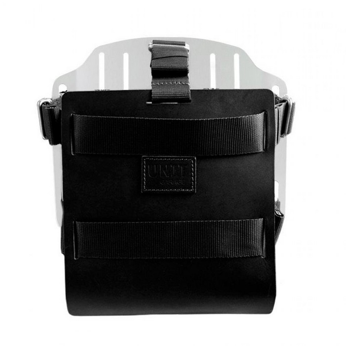 Σύστημα μεταφοράς από αλουμίνιο πλήρες με ρυθμιζόμενο δερμάτινο μπροστινό μέρος. Προσαρμόζεται γρήγορα στο πλαίσιο της μεταλικής πλάκας με το σύστημα ταχείας απελευθέρωσης cod.U000 που περιλαμβάνεται ήδη και είναι τοποθετημένο στο πίσω μέρος της πλάκας, το οποίο είναι εξοπλισμένο με κλειδαριά για κλείδωμα στο ίδιο το πλαίσιο. Η πλάκα δημιουργεί μια επίπεδη επιφάνεια στήριξης στο πλάι της μηχανής, που θα επιτρέψει τη μεταφορά μη στερεωμένων αποσκευών ή άλλων αντικειμένων, όπως υπνόσακους, μπουφάν κτλ. Το μπροστινό μέρος μπορεί να ρυθμιστεί χρησιμοποιώντας τα παρεχόμενα ρυθμιστικά και μπορεί να αφαιρεθεί πολύ γρήγορα από την πλάκα.