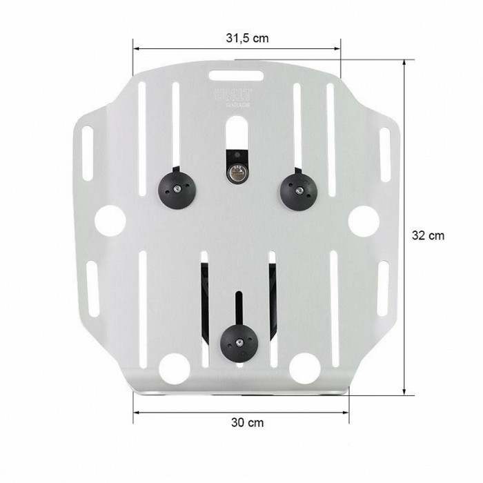 Σύστημα μεταφοράς από αλουμίνιο με ρυθμιζόμενο μπροστινό μέρος και σύστημα ταχείας απελευθέρωσης. Προσαρμόζεται γρήγορα στο πλαίσιο της μεταλικής πλάκας με το σύστημα ταχείας απελευθέρωσης cod.U000 που περιλαμβάνεται ήδη και είναι τοποθετημένο στο πίσω μέρος της πλάκας, το οποίο είναι εξοπλισμένο με κλειδαριά για κλείδωμα στο ίδιο το πλαίσιο. Η πλάκα δημιουργεί μια επίπεδη επιφάνεια στήριξης στο πλάι της μηχανής, που θα επιτρέψει τη μεταφορά μη στερεωμένων αποσκευών ή άλλων αντικειμένων, όπως υπνόσακους, μπουφάν κτλ. Το μπροστινό μέρος μπορεί να ρυθμιστεί χρησιμοποιώντας τα παρεχόμενα ρυθμιστικά και μπορεί να αφαιρεθεί πολύ γρήγορα από την πλάκα.