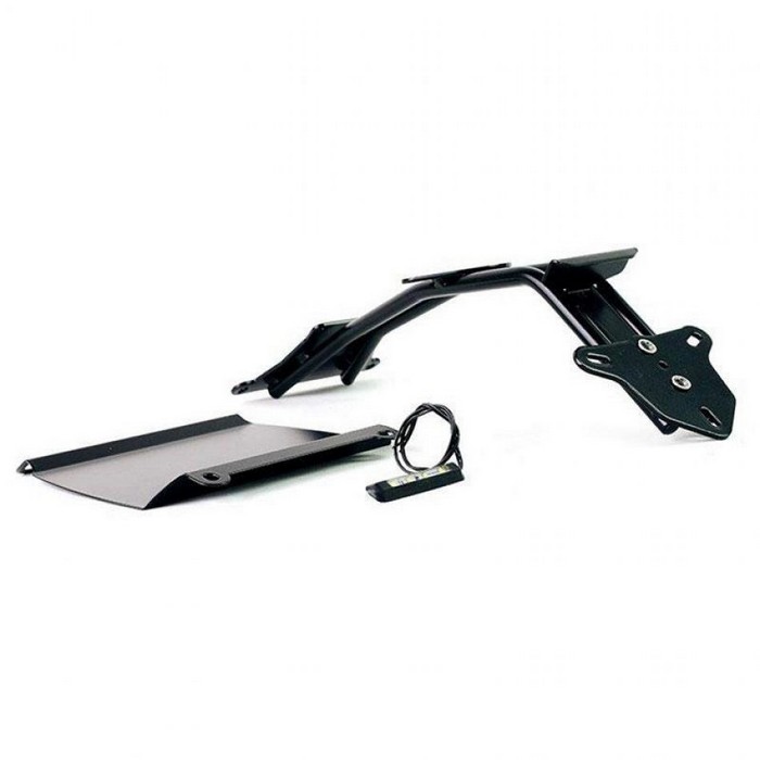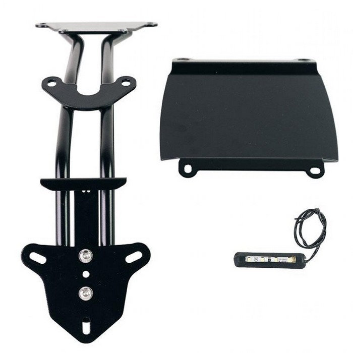 Κατασκευασμένο από χαλύβδινο σωλήνα βαμμένο μαύρο με εποξειδικές σκόνες. Παρέχεται πλήρης με αφαιρούμενο και ρυθμιζόμενο καθ’ ύψος φως πινακίδας κυκλοφορίας LED, προστατευτικό περίβλημα για να κλείνει την κάτω περιοχή του λασπωτήρα για να αντικαταστήσει το αρχικό πλαστικό, τις βίδες και τους αποσβεστήρες κραδασμών. Είναι πολύ απλό να στερεωθεί στο πλαίσιο και σας επιτρέπει να αλλάξετε σημαντικά τον χαρακτήρα και το στυλ της μοτοσικλέτας στο πίσω μέρος, κοντένοντας και ανεβάζοντας την πινακίδα κυκλοφορίας. Ολοκληρωμένο με όλο το απαραίτητο υλικό στερέωσης, είναι συμβατό με όλες τις σχάρες ή τις σχάρες αποσκευών μας.